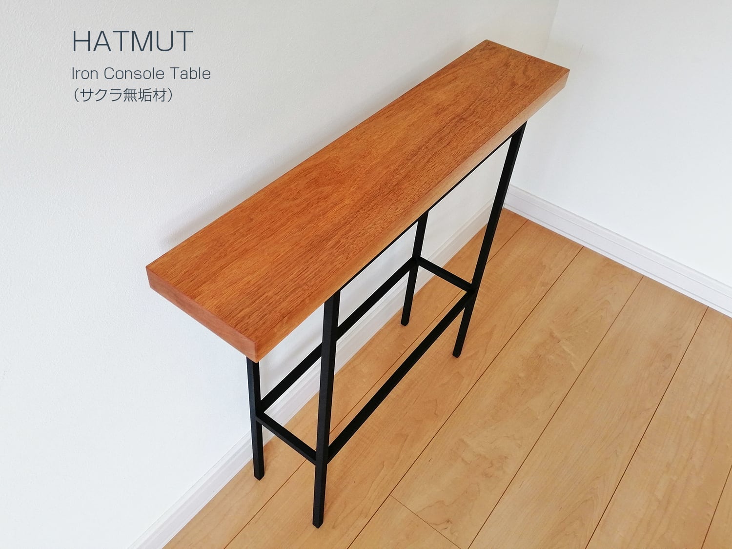 天板はサクラ無垢材とアイアンでシンプルデザインなコンソールテーブル。